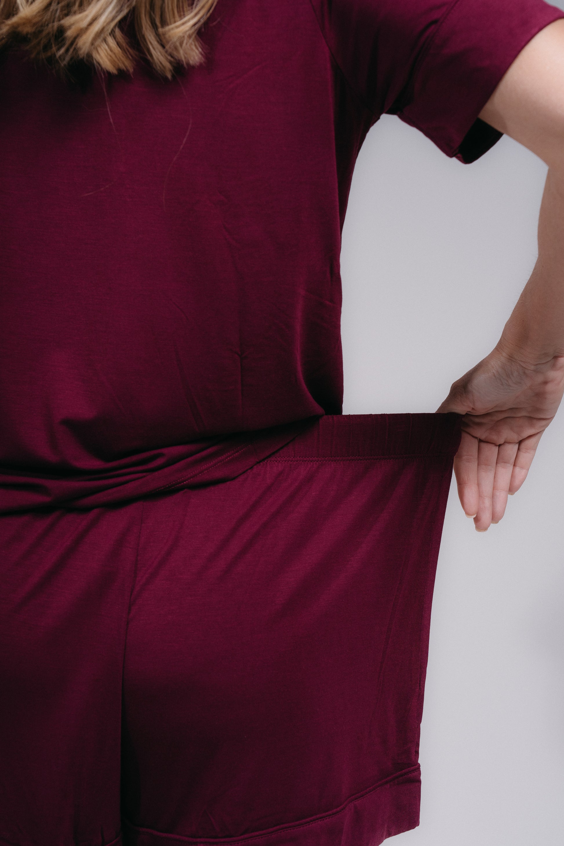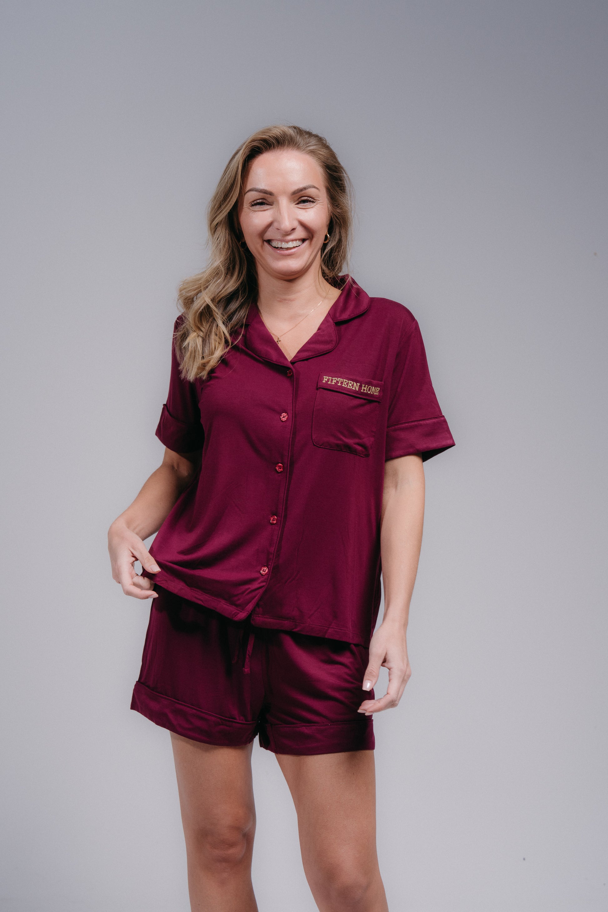 This luxurious two piece set includes a button up top and matching shorts with a super soft waistband, offering the perfect blend of style, comfort and sustainability.
